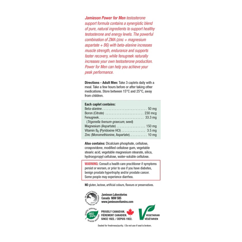 تقویت تستوسترون پاور مردانه جمیسون حاوی ترکیبی هم افزایی از مواد خالص و طبیعی برای حمایت از تستوسترون سالم و سطوح انرژی است. مکمل جیمسون ترکیب قدرتمند ZMA (روی + آسپارتات منیزیم + B6) همراه با بتا آلانین باعث افزایش قدرت عضلانی، استقامت و بهبود سریعتر می شود، در حالی که شنبلیله به طور طبیعی تولید تستوسترون شما را افزایش می دهد.