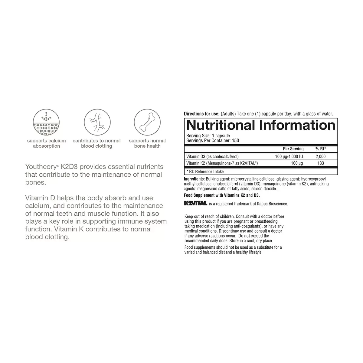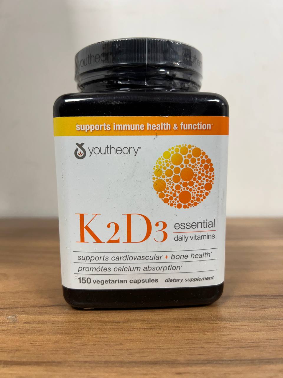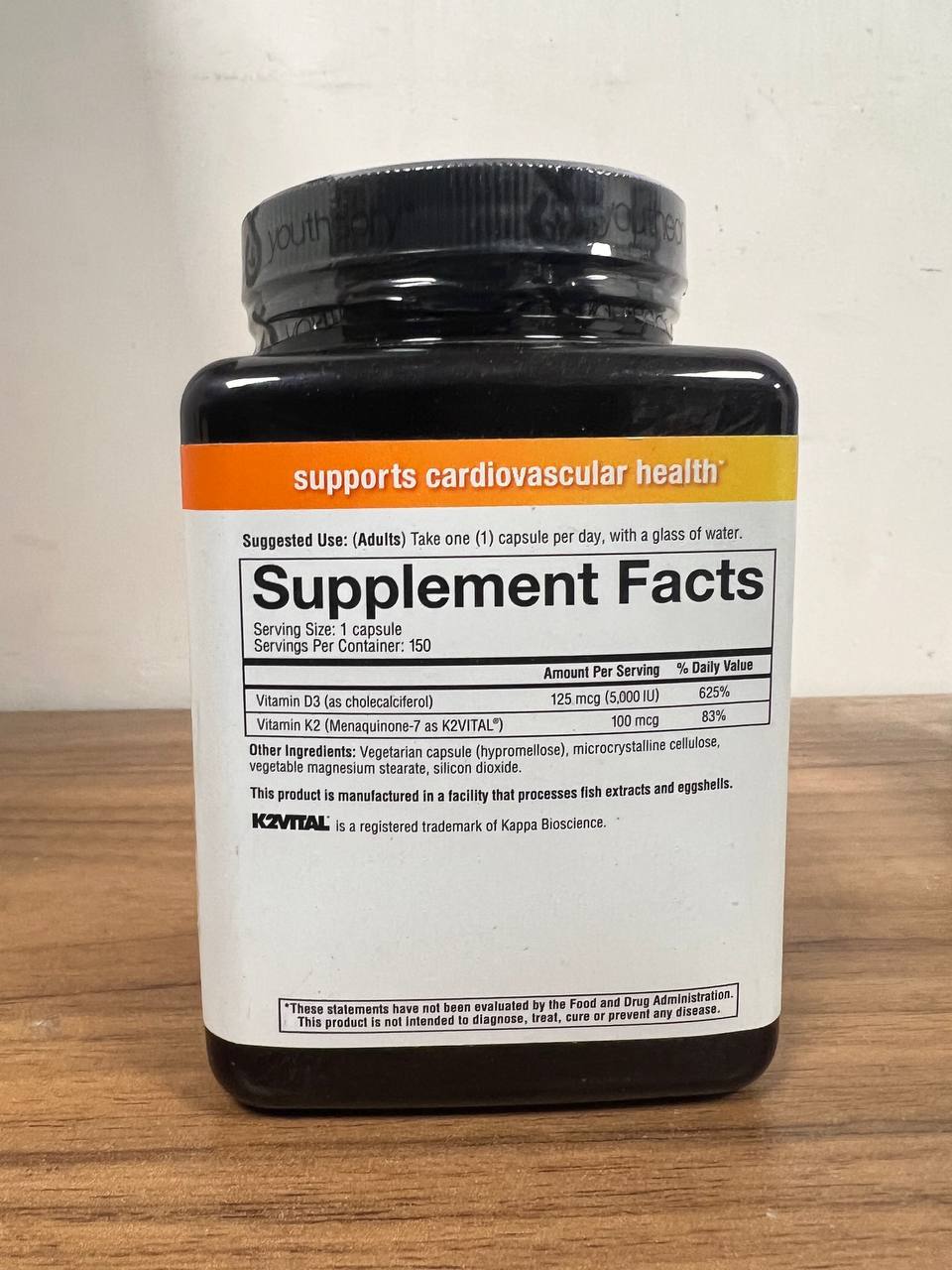ترکیبات و ارزش غذایی کپسول ویتامین D3 K2 یوتئوری 150 عدد Youtheory K2 D3(کولهکلسیفرول) – 125 میکروگرم (5000 واحد IU): ویتامین D3 یکی از مهمترین ویتامینهای محلول در چربی است که به جذب و نگهداری کلسیم در استخوانها کمک میکند. این ویتامین برای سلامت استخوانها، دندانها و سیستم ایمنی بدن ضروری است. کمبود ویتامین D3 میتواند باعث ضعف عضلانی، پوکی استخوان و مشکلات ایمنی شود.