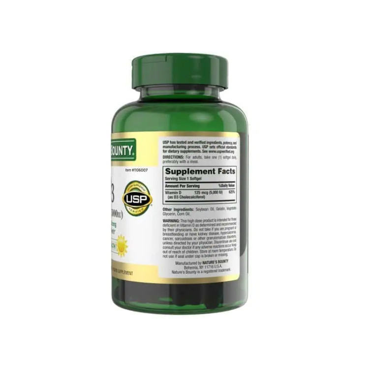 ویتامین د3 نیچرز بونتی 400 عددی 125 میکروگرم (5000 IU) فرم قوی و فعال ویتامین D را در یک سافت ژل یک بار در روز فراهم می کند. ویتامین D می تواند به عنوان یک هورمون در بدن عمل کند زیرا در تنظیم چندین عملکرد بسیار مهم نقش دارد.