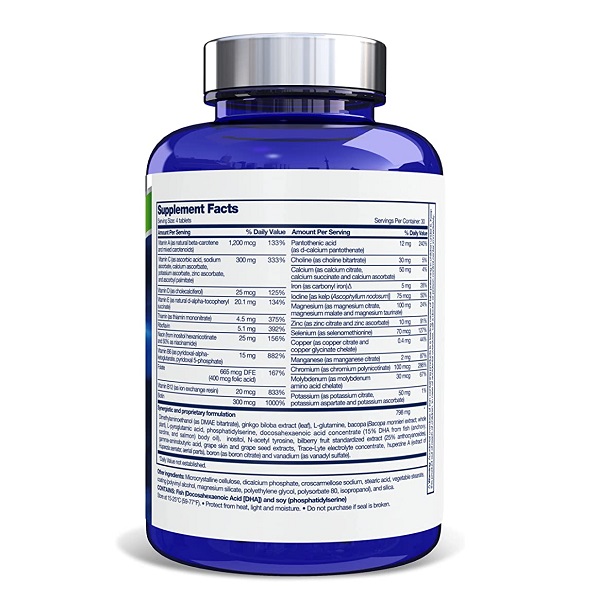 دی متیل آمینو اتانول (به عنوان بی تارتارات DMAE)، کولین (به عنوان بی تارترات کولین)، عصاره جینکو بیلوبا (برگ)، ال-گلوتامین، باکوپا (عصاره باکوپا موننیری؛ گیاه کامل)، اسید ال-پیروگلوتامیک، فسفاتیدیل سرین، کنسانتره اسید دوکوزاهگزانوئیک از DHA (15%) روغن بدن ماهی (آنچوی، ساردین و سالمون)، اینوزیتول، ان-استیل تیروزین، عصاره استاندارد میوه زغال اخته (25٪ آنتوسیانوزید)، اسید گاما آمینوبوتیریک، پوست انگور و عصاره هسته انگور، کنسانتره الکترولیت Trace-Lyte، هوپرزین A (عصاره هوپرزیا سراتا؛ اندام های هوایی)، بور (به عنوان سیترات بور) و وانادیم (به عنوان وانادیل سولفات).