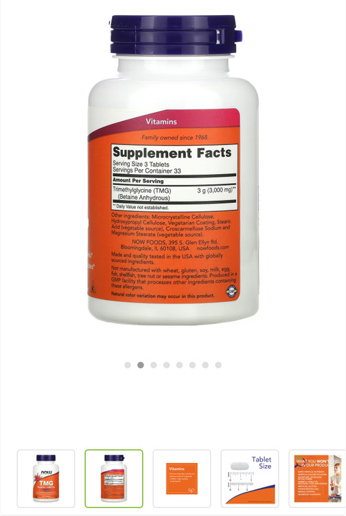 نحوه استفاده: یک دوز، سه قرص، TMG از Now Foods حاوی 3000 میلی گرم بتائین است که می توانید هر روز به بدن خود اضافه کنید.