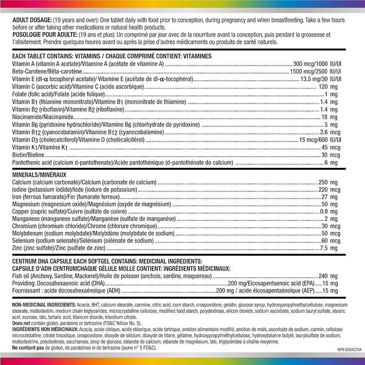 مکمل مولتی ویتامین و DHA قبل از تولد: Centrum Prenatal + DHA که مخصوص زنان قبل، حین و بعد از بارداری است، یک قرص مولتی ویتامین قبل از تولد را با یک ژل نرم کوچک از اسیدهای چرب امگا 3 DHA و EPA ترکیب می کند.