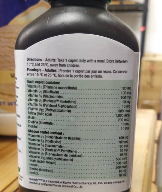 ویتامین B1 (تیامین مونونیترات) 100 میلی گرم ویتامین B2 (ریبوفلاوین) 100 میلی گرم ویتامین B3 (نیاسین آمید) 100 میلی گرم ویتامین B5 (PantesinTM) 10 میلی گرم ویتامین B6 (پیریدوکسال 5- فسفات) 10 میلی گرم ویتامین B12 (متیل کوبالیک اسید AF0MF50) ) 1000 میکروگرم بیوتین 200 میکروگرم کولین (بی تارترات) 10 میلی گرم اینوزیتول 10 میلی گرم PantesinTM یک علامت تجاری Kyowa Pharma Chemical Co., Ltd. همچنین حاوی: سلولز، دی کلسیم فسفات، سلولز محلول در آب، سلولز گیاهی اسید تانیل هیدروکسی، هیدروکسی دی اکسیدریک پرو سیلیس، ریبوفلاوین، طعم طبیعی نعناع، استئارات منیزیم گیاهی. غیر GMO NO نمک (NaCl)، گلوتن، لاکتوز، طعم دهنده های مصنوعی یا مواد نگهدارنده.