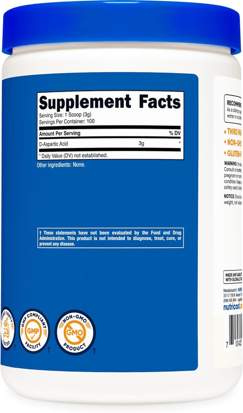 Nutricost D-Aspartic Acid یک مکمل باکیفیت است که از DAA خالص برای حمایت از سطوح هورمونی طبیعی بدن استفاده میکند. این مکمل بهویژه برای افرادی که به دنبال افزایش طبیعی تستوسترون و تقویت عملکرد ورزشی و بدنی هستند، مناسب است.