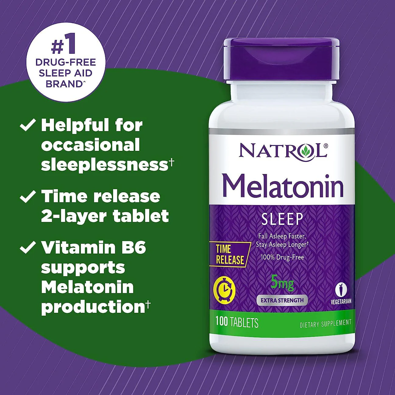 مکمل Natrol Melatonin آزادسازی تدریجی ملاتونین در طول شب را فراهم می کند. این ویژگی میتواند به حفظ سطح مناسب ملاتونین در بدن و بهبود کیفیت خواب کمک کند.